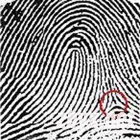 反箕纹的主要特征是具有一个三叉点(Triradius),并且其循环纹路尾巴指向姆指,如上图所示,该图是个右手指纹,其中红色圆圈为三叉点,而尾巴朝向左边(即右手姆指区)。